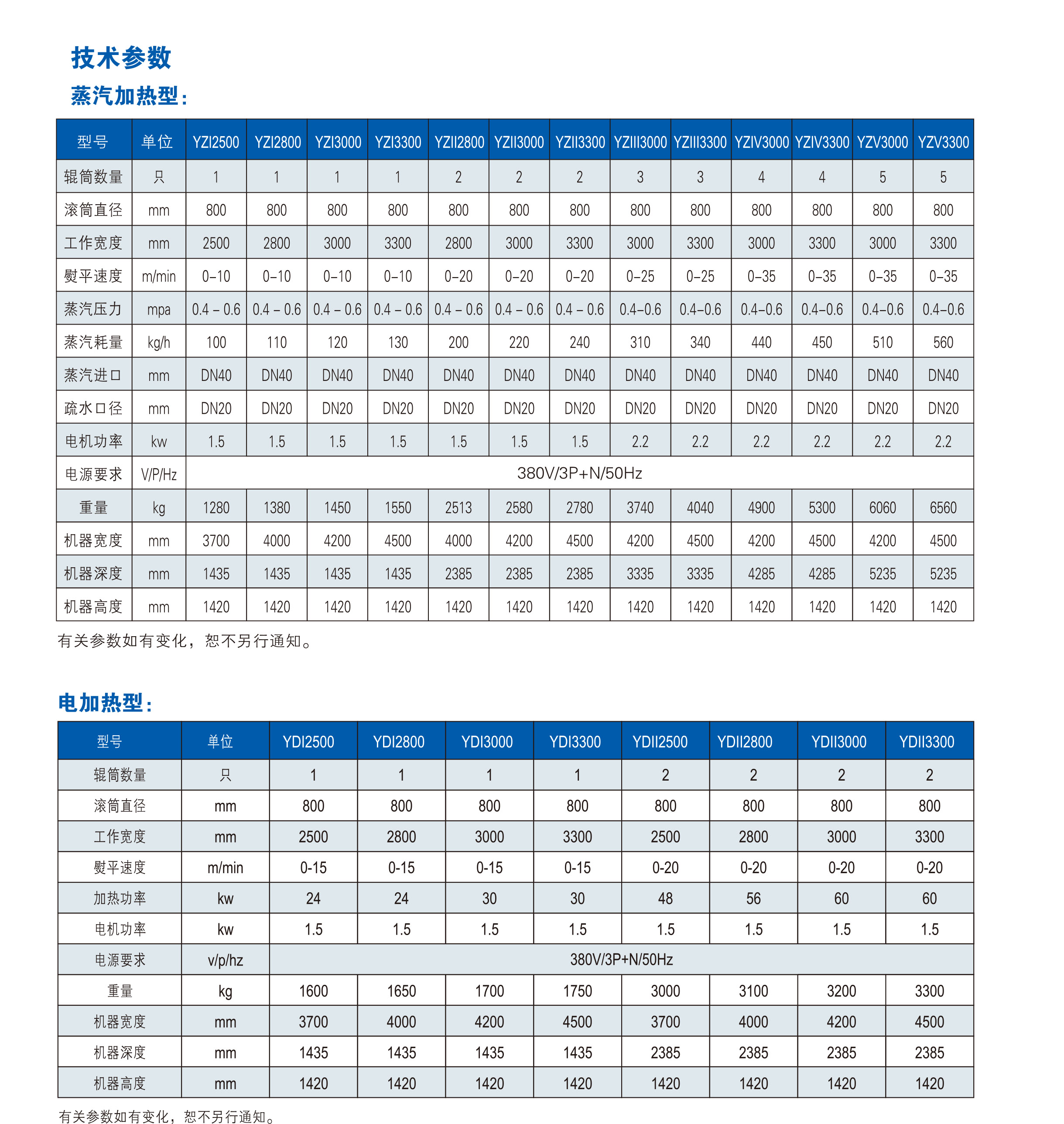 • 有多種燙平機(jī)可供選擇,輥筒直徑800mm,輥筒數(shù)量有單輥、雙輥、三輥、四輥、五輥、六輥等,熨平寬度有2.5米、2.8米、3米、3.3米,加熱方式:蒸汽加熱及電加熱方式。